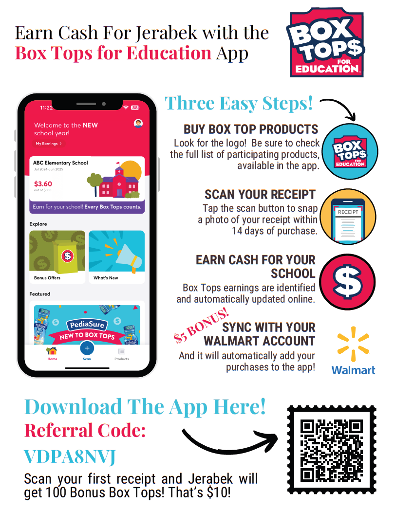 Box Tops Jerabek is a Box Tops for Education School! Download the app today to start earning for Jerabek. Be sure to enter the referral code VDPA8NVJ